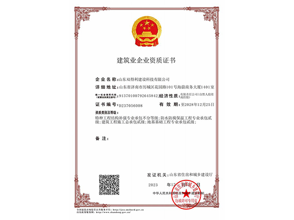山東雙得利建設(shè)科技有限公司是一家集科研、工程技術(shù)開發(fā)、咨詢、工程結(jié)構(gòu)加固改造檢測、設(shè)計、施工于一體的綜合性、專業(yè)化企業(yè)。公司注冊資金5001萬元,具備建筑工程施工總承包貳級、主體結(jié)構(gòu)工程檢測、特種工程結(jié)構(gòu)補強專業(yè)承包不分等級、地基基礎(chǔ)工程專業(yè)承包貳級、防水防腐保溫工程專業(yè)承包貳級、施工勞務(wù)不分等級資質(zhì)。現(xiàn)有高素質(zhì)人才126人,其中高級工程師6人,一級注冊結(jié)構(gòu)工程師2人,一級注冊建造師3人,一級注冊造價師2人,注冊監(jiān)理工程師2人,二級注冊結(jié)構(gòu)工程師4人,二級注冊建造師10人,中級工程師30余人,其他專業(yè)技術(shù)人員30余人。公司所有工程技術(shù)人員均從事工程施工行業(yè)多年。
